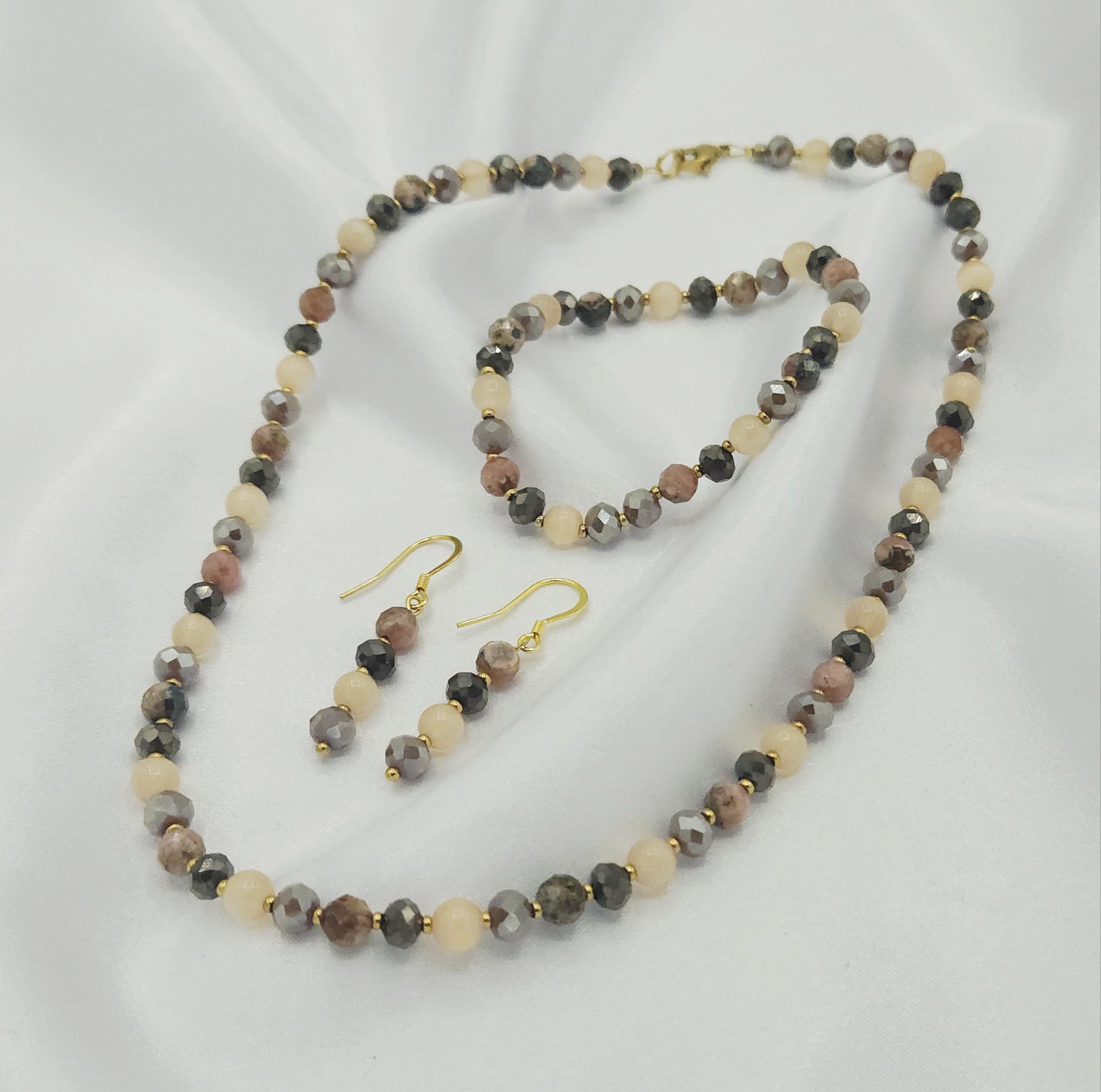 Zestaw biżuterii z naturalnych kamieni – rodochrozytu, kociego oka, hematytu oraz szlifowanych kryształków. Połączenie subtelnych odcieni beżu, brązu i szarości tworzy elegancką, stonowaną kompozycję pasującą do każdej stylizacji. Biżuteria zachwyca delikatnym blaskiem i harmonią barw, łącząc naturalne piękno z nowoczesną formą.